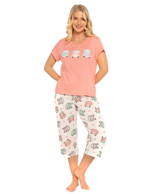 Coral Campervan 100% Cotton Short Sleeved Cropped Leg Pyjamas (NW200065)