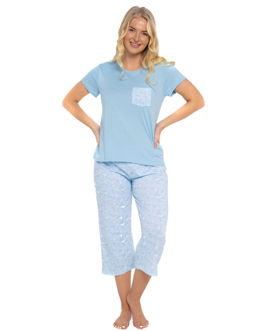 Soft Blue Lace Butterfly 100% Cotton Short Sleeved Cropped Leg Pyjamas (NW200067)