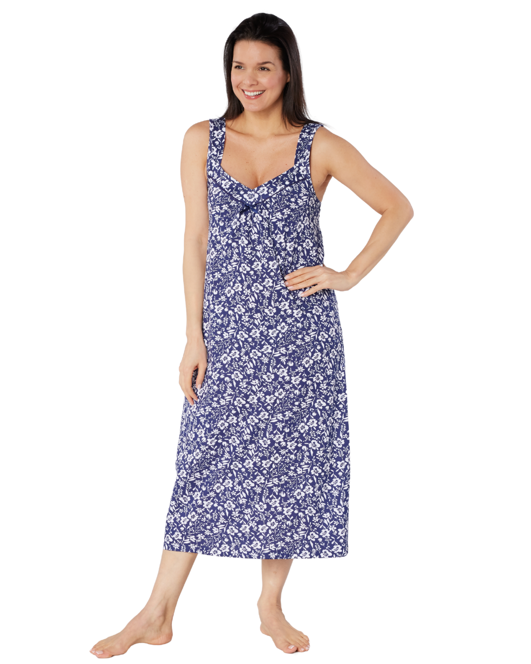 Experience ultimate comfort and elegance with this delightful sleeveless nightgown. Crafted in a soothing light blue or soft pink hue adorned with a subtle floral pattern, this mid-length nightdress features a graceful sweetheart neckline and wide shoulder straps, and a soft elasticated back for optimal support. The flowing silhouette with gentle gathering at the bust creates a flattering, relaxed fit that allows for unrestricted movement during sleep or lounging.