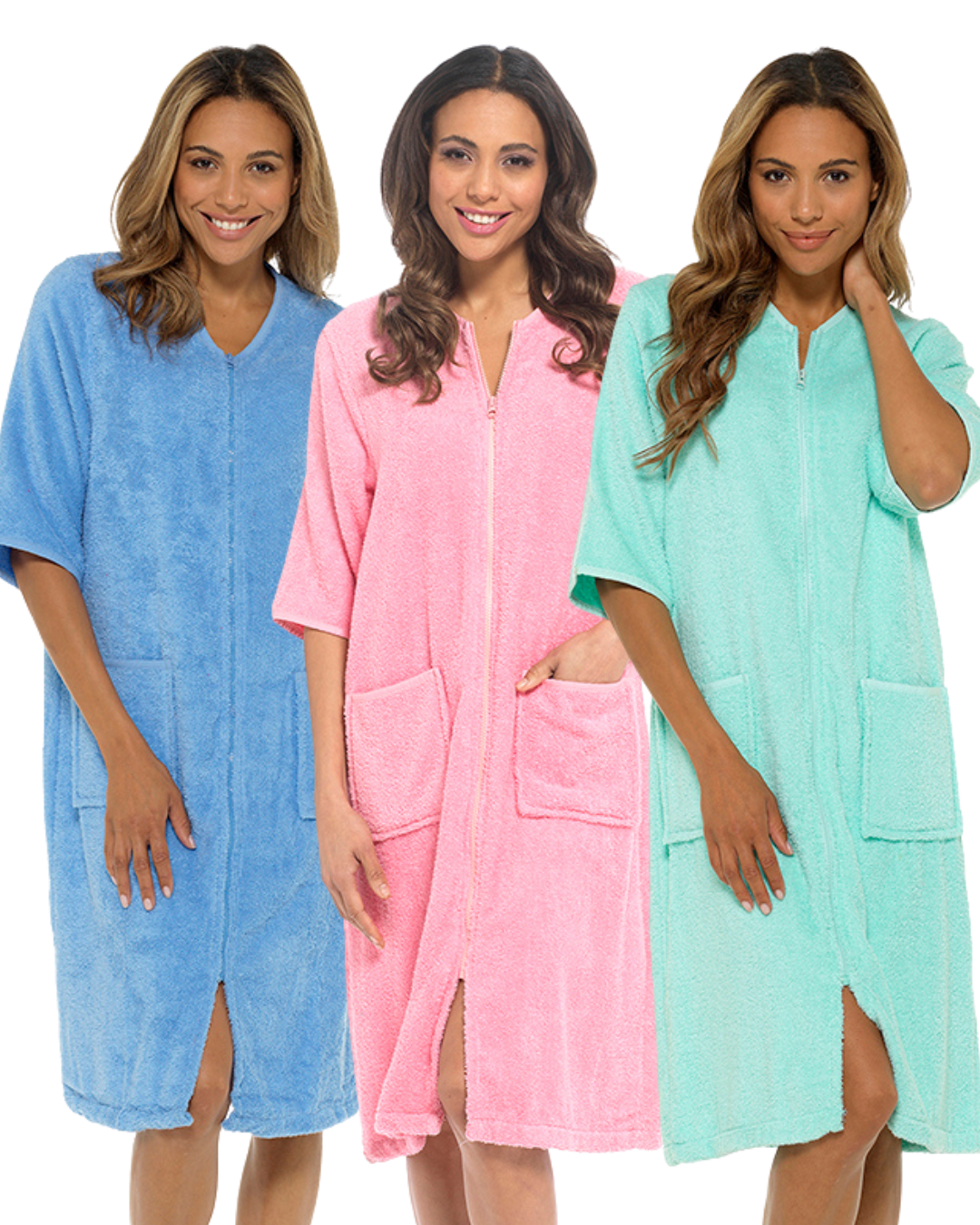 Great quality 100% cotton towelling gown with zip front fastening, 2 patch pockets and 3/4 sleeves.